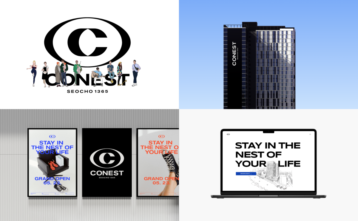 코네스트 BX 디자인. CONEST는 청년임대주택 브랜드로, ‘안정적인 주거+자신감 넘치는 당당함’을 모티브로 네이밍, 브랜드 심볼, 로고 디자인, 사인 디자인 등 브랜드 전반적인 그래픽 디자인을 개발했다. 디자인 콘셉트는 대담하고 세련된 이미지로, ‘청년들이 당당히 자신의 라이프스타일을 누리는 도심 속 안식처’를 표현했다.