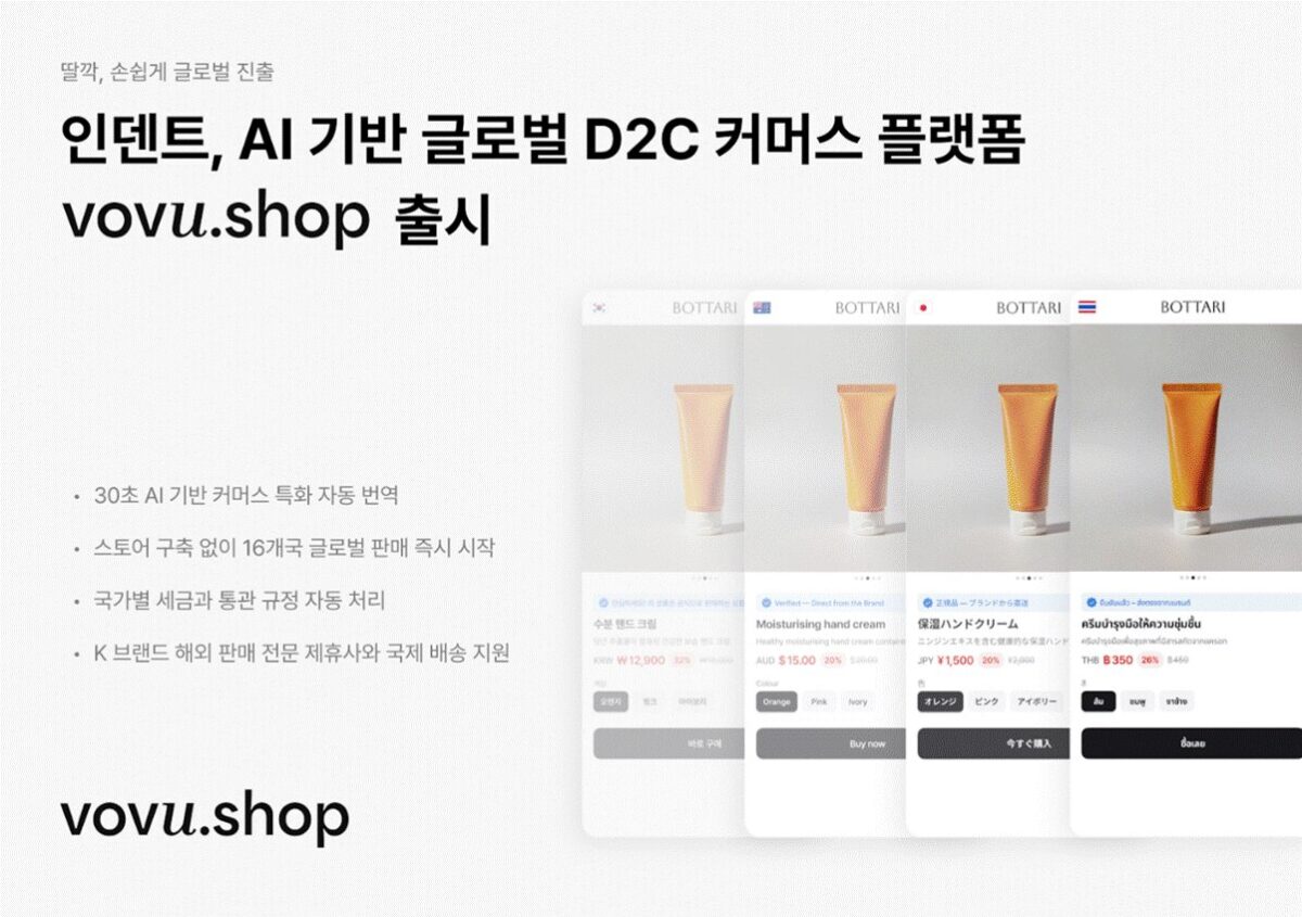 커머스 AX 전문 기업 인덴트코퍼레이션(이하 인덴트)이 AI 기반의 글로벌 크로스보더 커머스 플랫폼 ‘보부샵(vovu.shop)’을 정식 출시했다고 18일 밝혔다.