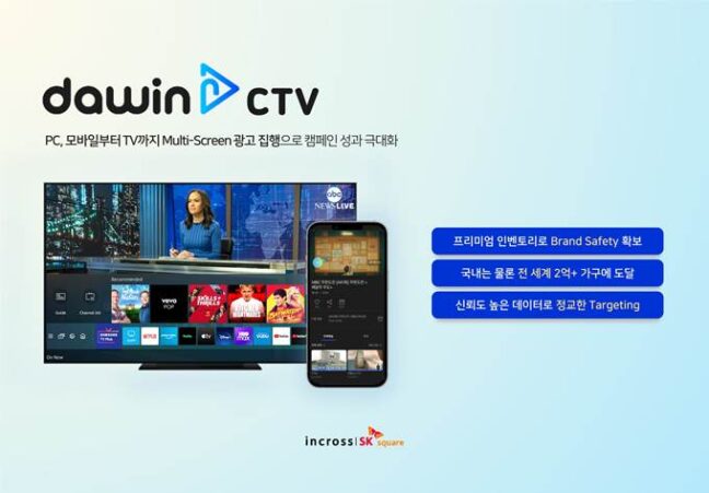 SK그룹의 디지털 광고 전문기업 인크로스가 자사 동영상 애드 네트워크 플랫폼 ‘다윈(dawin)’에 CTV(Connected TV) 매체를 연동한 신규 패키지 상품 ‘다윈 CTV’를 론칭, CTV 광고 사업에 나선다고 14일 밝혔다.