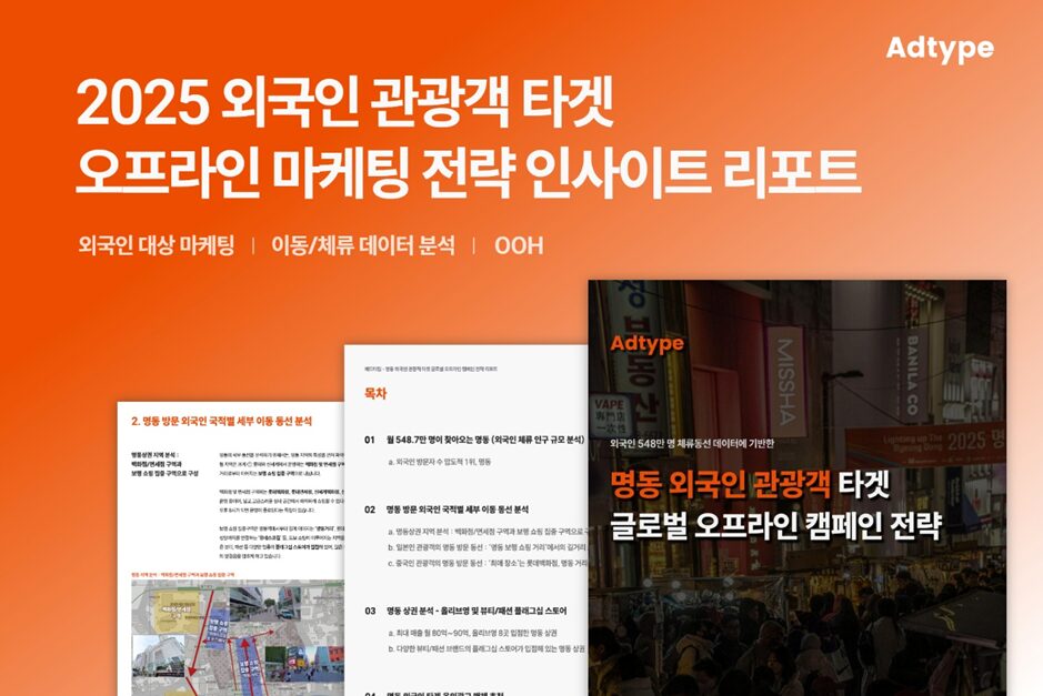 Data·AI 기반 종합광고 테크 컴퍼니 드래프타입의 옥외광고 사업부문 애드타입(Adtype)이 급증하는 방한 외국인 관광객을 겨냥한 ‘명동 외국인 관광객 타겟 글로벌 오프라인 캠페인 전략 리포트’를 발간했다고 24일 밝혔다.