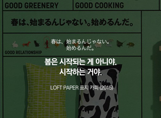 추천하고 싶은 카피가 또 있는데, 일본의 대형 잡화점인 ‘로프트(Loft)’의 “봄은 시작되는 게 아니야, 시작하는 거야”라는 카피예요. 봄이 오고, 많은 게 시작될 것 같은 시기잖아요. 스스로 마음먹고 움직여야 정말 시작되는 거다, 그런 의미에서 이 카피도 추천하고 싶어요.