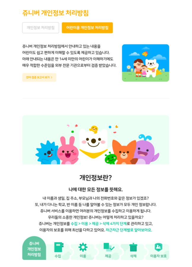 이날 네이버가 공개한 ‘아동용 개인정보 처리방침’은 성인용 개인정보 처리방침과는 구분해 14세 미만 아동의 눈높이에서도 쉽게 이해할 수 있도록 구성했다는 점이 특징이다. 네이버는 해당 아동용 개인정보 처리방침은 서울대학교 국어연구소와 함께 내용의 적정성 여부 검증을 수행하고 이에 따른 검증 보고서도 함께 공개했다.