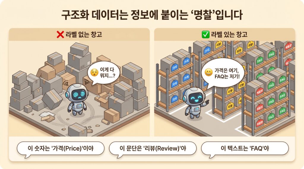 사람은 ‘가격: 10,000원’이라고 적혀 있으면 이것이 제품 가격임을 직관적으로 압니다. 하지만 AI에게는 그저 숫자와 문자의 나열일 뿐입니다. 이때 필요한 것이 구조화 데이터(Structured Data)입니다.