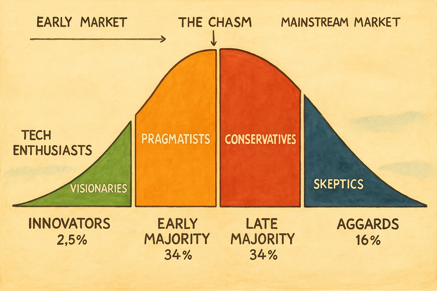 이와 같은 흐름은 기술 수용 생애주기 이론에서 말하는 ‘캐즘(Chasm)’ 현상과 깊은 관련이 있다. 캐즘은 새로운 기술이 초기 수용자(early adopters)를 넘어 주류 시장(early majority)으로 확산되기 전, 반드시 겪는 간극이다. 많은 기술이 이 캐즘을 넘지 못하고 시장 안착에 실패하며, 생성형 AI 역시 한때 이러한 위험에 직면했다.