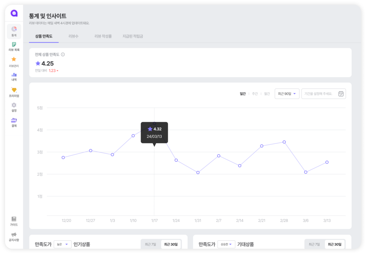 이번에 새롭게 업데이트된 통계 & 인사이트 기능은 기존 알파리뷰 대시보드 내에서 별다른 설치 과정 없이 사용할 수 있다. 방대한 양의 상품 만족도를 한눈에 파악할 수 있는 점이 장점이다. 고객이 남긴 리뷰의 평균 평점을 통해 제품별로 얼마나 신뢰할 수 있는지 확인할 수 있다.