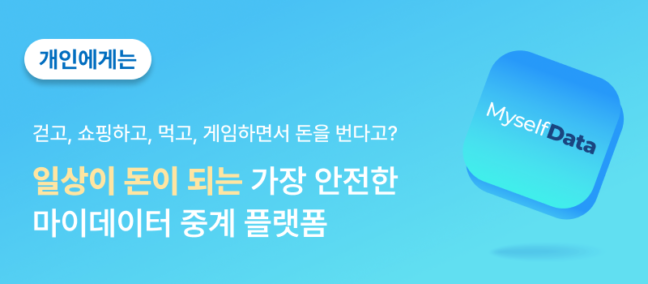 마이셀프데이터는 건강, 쇼핑, 게임 등 일상 생활 영역의 데이터를 정보주체가 직접 수집하고, 이를 다양한 수요기업들과 연계함으로써 그에 따른 보상과 다양한 맞춤 서비스를 제안하는 플랫폼입니다. 커뮤니티를 통해 건강, 쇼핑, 게임 등 일상생활에서 발생하는 사용자의 데이터를 수집하고, 수요 있는 기업들과 연결하는 방식으로 운영됩니다.