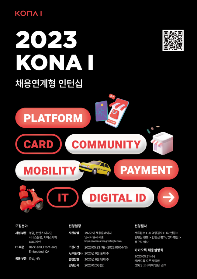 채용 관련 자세한 내용은 채용 홈페이지를 참조할 수 있으며, 이달 31일 카카오톡 오픈채팅 상담회 ‘2023 코나아이 인턴’을 통해 문의 가능하다.
