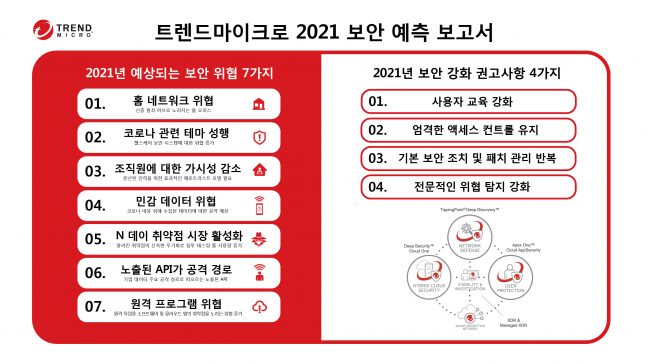 트렌드마이크로가 선정한 2021년도 일곱 가지 주요 보안 예측 사항으로는 ▲홈 네트워크 위협 ▲코로나19 관련 테마 위협 성행으로 인한 헬스케어 보안시스템 위협 증가 ▲하이브리드 업무 환경에서의 조직원에 대한 가시성 감소 ▲코로나19 대응을 위해 수집된 민감 데이터에 대한 위협 ▲기존에 이미 알려진 취약점의 신속한 무기화 ▲데이터 주요 공격 경로로 예상되는 노출된 API ▲원격 작업용 소프트웨어 및 클라우드 앱의 취약점을 노리는 위협 증가이다.
