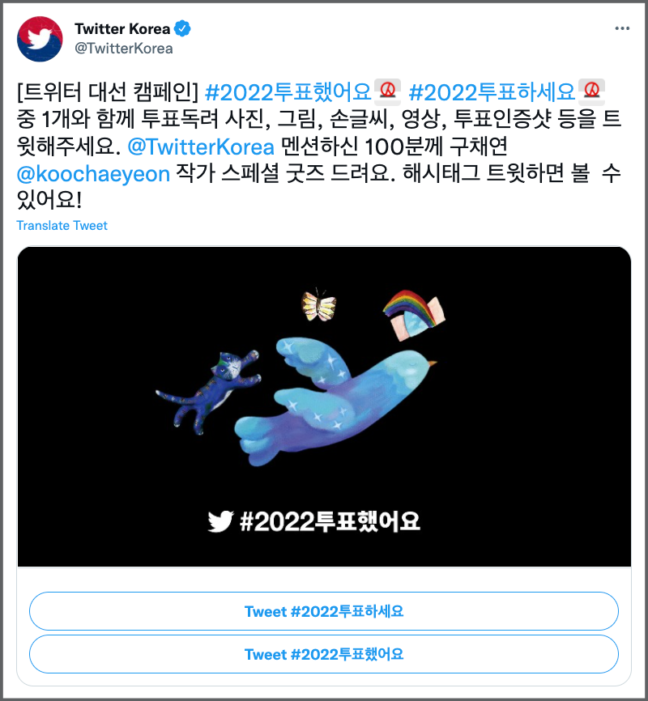 트위터 이용자들은 투표 인증이나 투표를 독려하는 사진과 그림, 손글씨, 영상 등을 해시태그 ‘#2022투표하세요’ 또는 ‘#2022투표했어요’와 함께 트위터 코리아 공식 계정(@TwitterKorea)을 멘션해 트윗하면 캠페인 참여가 완료된다.