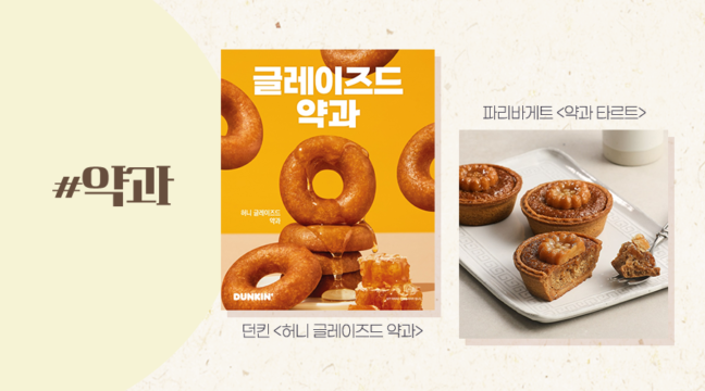 이 같은 약과의 높은 인기에 식품업계는 줄줄이 약과를 활용한 할매니얼 디저트 신메뉴를 출시하고 있는데요. 던킨은 글레이즈드 도넛 모양의 약과에 달콤한 허니 글레이징을 입혀 약과 특유의 달달하면서 꾸덕한 맛과 식감을 살린 ‘허니 글레이즈드 약과’를 출시했고, 파리바게트는 타르트 속에 조청으로 만든 시나몬 카라멜 필링을 담고, 위에는 미니 약과를 올린 ‘약과 타르트’ 제품을 선보였어요.