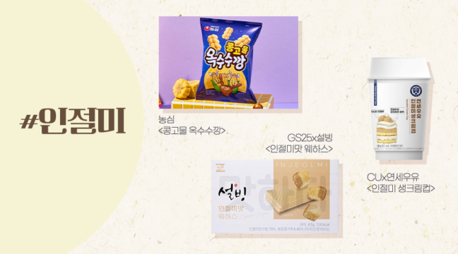 농심은 지난 2월, 달콤한 옥수수깡에 고소한 콩고물을 더한 ‘콩고물 옥수수깡’을, GS25 편의점은 설빙과의 콜라보로 ‘인절미맛 웨하스’를 선보였어요. 특히, CU와 연세우유의 콜라보로 탄생한 ‘인절미 생크림컵’은 출시 한 달 만에 누적 판매량 30만 개를 돌파했어요. (꼬수운 건 못 참지!?)