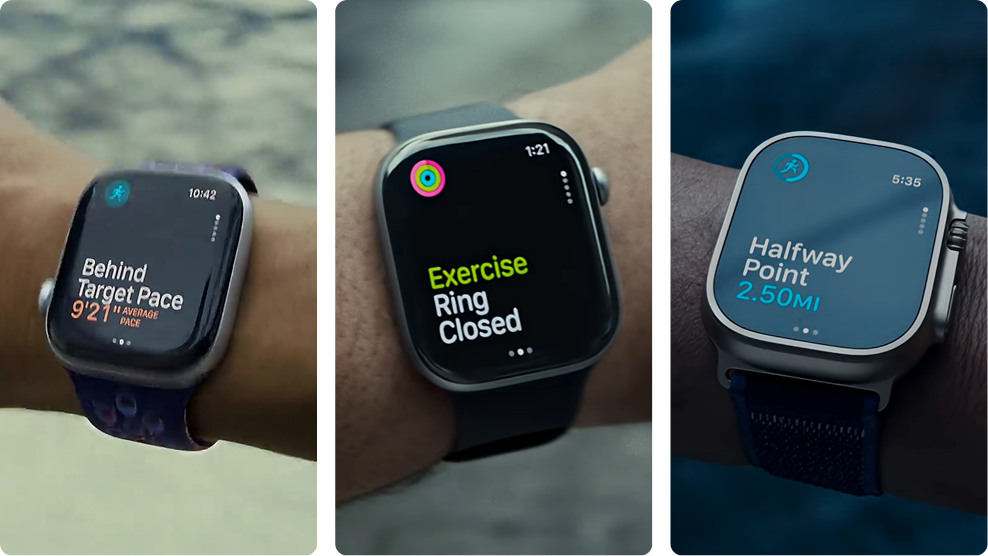 3개의 영상에서는 캠페인의 진짜 주인공인 애플워치의 컷도 돋보이는데요. 모두 운동 앱의 기능으로, 속도 업데이트, 활동 링, 운동 현황 등이 은은하게 노출돼요. 간단한 장면일 수 있지만 이를 통해 애플은 애플워치가 단순 ‘운동을 돕는 피트니스 트래커’가 아닌 ‘사용자의 동기 부여를 자극하는 동반자’라는 의미를 담았죠.​