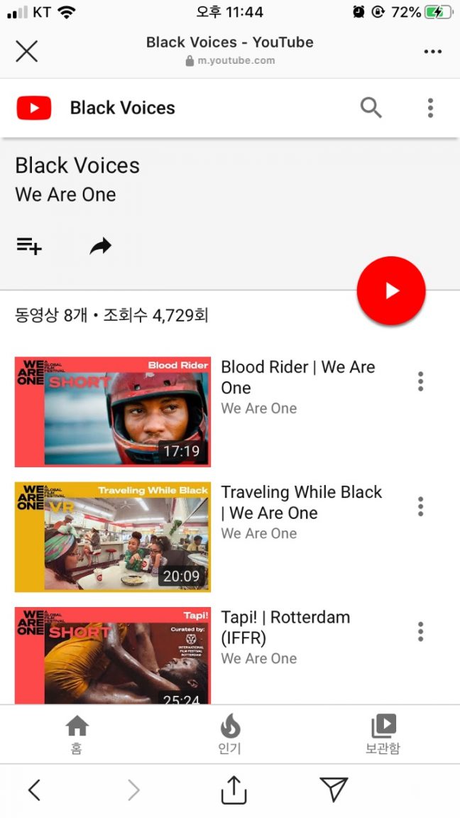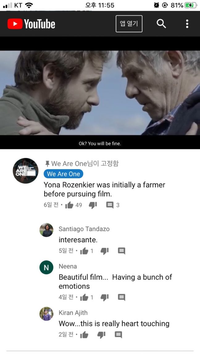 메인 화면은 크게 두 가지로 나뉜다. 오늘이 며칠째인지를 알리는 영역과 테마별 영화리스트를 모아놓은 영역. ‘Black Voices’, ‘Animation’, ‘Learn From the Best’ 등 사회적 목소리를 담은 작품부터 영화인들의 대담에 이르기까지 다양한 주제의 영화를 모아 볼 수 있었다. 특히 장애를 주제로 다룬 영화들을 모은 플레이리스트가 인상적이었다. 칸 영화제 출품작 <Butterflies(버터플라이스)>에서 눈이 보이지 않는 아버지와 가족이 어딘가를 이동하다가 마주친 나비 떼에 황홀해하는 장면이 있었는데, 댓글 창에 ‘감독 요나 로젠키엘은 영화를 만들기 전에 농부였다.’는 위아원 공식 계정의 설명이 있었다. 사람들은 ‘인상 깊다’며 몰랐던 영화에 대한 생각을 댓글로 나눴다. 간략한 댓글이었지만 그 한 마디가 사람들에게 새로운 정보가 되고, 생각을 자유롭게 나누는 점이 실제 영화제의 GV(Guest Visit) 시간과 비슷하다고 느꼈다.