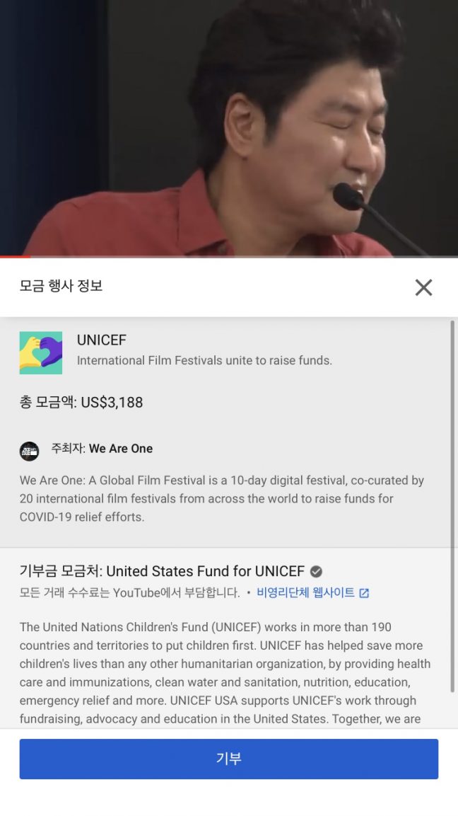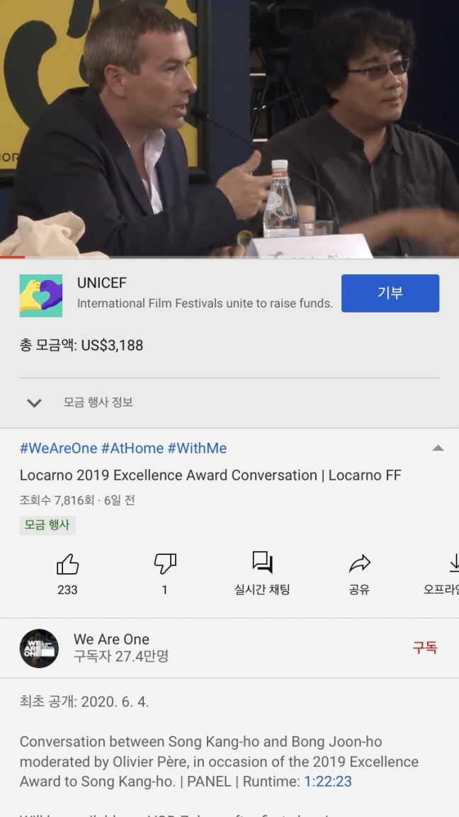 눈에 띄는 점은 화면 하단에 코로나19를 위한 모금 창이 있다는 것이다. 유니세프 기부금을 모을 수 있는데, ‘기부’ 버튼을 클릭하면 웹사이트로 바로 이동한다. 온라인 영화제의 배경을 상기시키면서 코로나19를 위해 힘쓰는 사람들을 기부로 응원하게 하는 점이 뜻깊었다. 2019 로카르노영화제에서 진행했던 송강호와 봉준호의 인터뷰 역시 흥미로웠다. 송강호가 배우를 꿈꾸게 됐던 계기부터 한국 영화의 흐름에 대한 봉준호의 시각을 엿볼 수 있었다. 아쉬운 점은 한국인 인터뷰는 쉽게 볼 수 있었지만, 다른 여러 영화인의 대담 및 영화들은 영어 자막밖에 없어 보기 쉽지 않았다는 점이다. 더 다양한 언어의 자막을 지원한다면 ‘WE ARE ONE’이라는 의미도 살리고, 영화제 자체도 더 많은 사람이 즐길 수 있을 것이라는 생각이 들었다.
