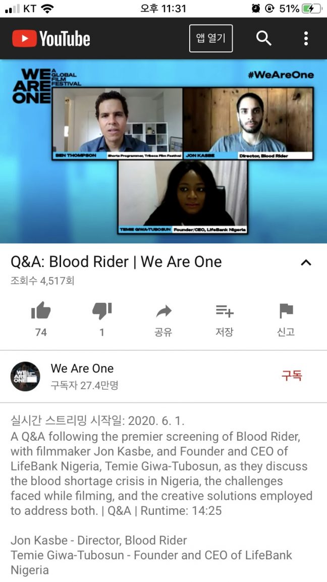 온라인 영화제가 오프라인 영화제와 다른 점은 어디서든 쉽게 감상할 수 있다는 것 아닐까? 영화제의 신나는 현장감을 느낄 수 없어 아쉬웠지만 영화를 감상하는 데 있어 온라인이 더욱 편리했던 건 사실이다. 우선, 티켓 예매가 필요 없었다. 오프라인 영화제에서는 인기 있는 영화의 경우 티켓 예매에 실패했을 때 오는 아쉬움과 불편함이 있었지만, 위아원에서는 직접 원하는 시간에 유튜브로 들어가 클릭만 하면 됐다. 간편한 감상이었다. 두 번째로는 영화인들의 대담을 화상통화로 감상할 수 있다는 것이었다. 영화와 관련해 질문과 대답을 하는 라이브 방송의 경우 생방송으로 영화인의 대답을 들을 수 있어 직접 화상 통화를 하는 느낌이 들어 신선했다. 마지막으로는 VR 영화를 감상할 수 있다는 점이다. 내가 원하는 각도로 조절하면 360도의 뷰로 영화를 감상할 수 있었다. 관객에게 직접 참여할 기회를 영화로 제공한 것이다.