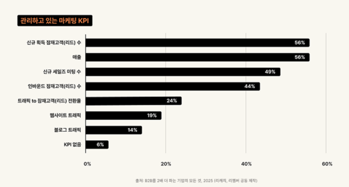 데이터에 따르면, 신규 잠재고객(리드) 발굴 건수와 매출이 각각 56%로 가장 많이 관리되는 KPI로 나타나고 있어요. 신규 세일즈 미팅 수가 49%로 그 뒤를 이으며, 인바운드 잠재고객 수는 44%가 관리하고 있습니다. 상대적으로 트래픽이나 클릭률 같은 세부 마케팅 지표는 낮은 비중을 보이는데, 이는 B2B 마케팅의 초점이 직접적인 고객 참여와 세일즈 전환에 더 많이 맞춰져 있음을 시사합니다.
