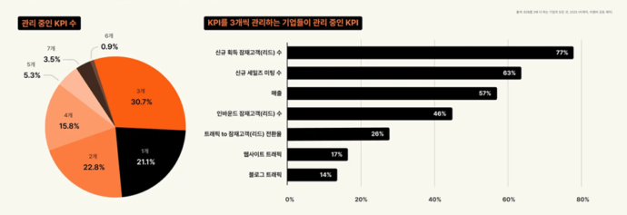 2배 더 파는 기업의 80%는 2개 이상, 특히 3개의 KPI를 관리하는 경우가 가장 많았어요. 이는 기업들이 과도한 지표 추적보다는 특정 핵심 지표에 집중하여 관리 효율성을 높이려는 경향을 반영된 결과라고 볼 수 있습니다.