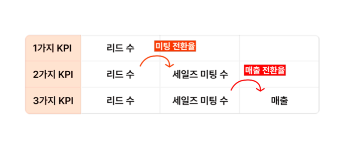 이 과정에서 기업들은 각 단계의 성과를 측정하기 위해 KPI를 설정하게 되며, 자연스럽게 KPI의 구조가 파이프라인과 유사하게 구성되게 됩니다. 2배 더 파는 B2B 마케팅 팀의 KPI가 ‘리드 발굴 → 세일즈 미팅 → 매출 전환’으로 연결되는 구조는 리드 발굴에서 세일즈 미팅을 거쳐 매출 전환으로 이어지는 파이프라인 시스템, 그리고 각 단계마다 KPI를 설정해 관리하는 체계를 갖추고 있음을 나타내는 것이죠.