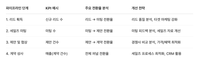 만약 KPI가 단순히 ‘리드 수’나 ‘매출’에만 있다면, 매출이 저조할 때 리드의 문제인지, 미팅 과정의 문제인지, 협상 단계의 문제인지 정확히 알기 어렵습니다. 파이프라인을 세세하게 쪼개고, 각 단계별로 전환율을 관리했을 때 비로소 병목 구간들을 발견하고 개선할 수 있어요. 예시와 함께 살펴 보겠습니다.