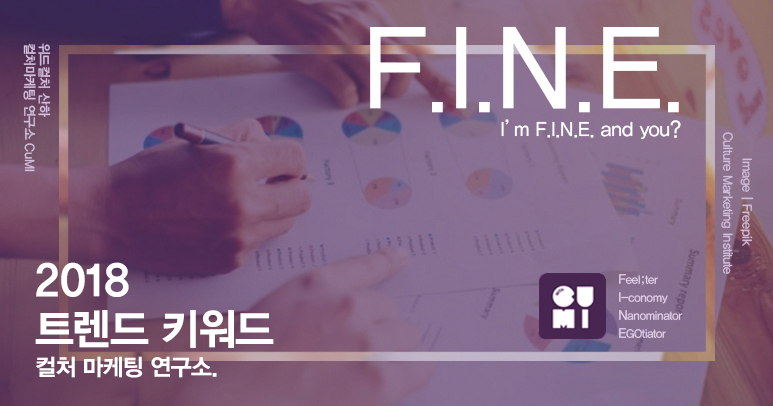 문화 마케팅 그룹 위드컬처 산하 컬처 마케팅연구소 ‘CuMI’가 제안한 F.I.N.E을 통해 보면 2018년을 살아갈 우리는 막연한 성공보다는 나 스스로 만족할 수 있는 작은 행복을 좇고, 불필요한 소유보다는 나에게 꼭 맞춘 소비와 서비스를 이용할 줄 아는 자신에게 합리적인 ‘개인’으로, 나와 다르다고 해서 무시하거나 배제하기보다는, 내 인생 못지않게 타인의 삶도 존중하고 손뼉 쳐 줄 수 있는 정말 ‘괜찮은=F.I.N.E’ 사람들로 성장할 것으로 보인다. 올 한해에는 스스로 삶을 가치 있게 꾸려나가는 건강한 ‘개인’으로 성장하는 ‘괜찮은(FINE)’ 한 해로 만들어 보는 것이 어떨까?