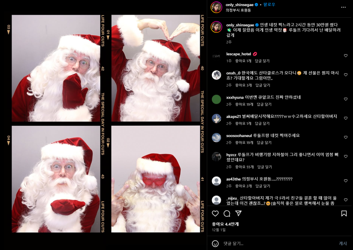 이런 공공기관 콘텐츠의 영향으로 일반 기업도 부계정을 만들어 담당자의 캐릭터로 이야기를 꺼내는 식의 콘텐츠를 통해 인기를 얻기도 했죠. 최근 산타클로스가 점령한 신세계 인스타그램 계정도 눈에 띄어요. 지금까지 시도하지 않은 사례로, ‘크리스마스=신세계’라는 메시지를 명확히 새겼죠.