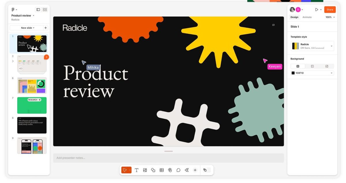 프레젠테이션 도구인 피그마 슬라이드 역시 범용 디자인 도구로서의 입지를 굳히는 데 결정적인 역할을 했다. 기존의 정적인 슬라이드 도구들과 달리 피그마는 실제 디자인 파일과 실시간으로 연동되는 프로토타입을 슬라이드 내에 직접 임베딩할 수 있는 독보적인 강점을 지닌다.