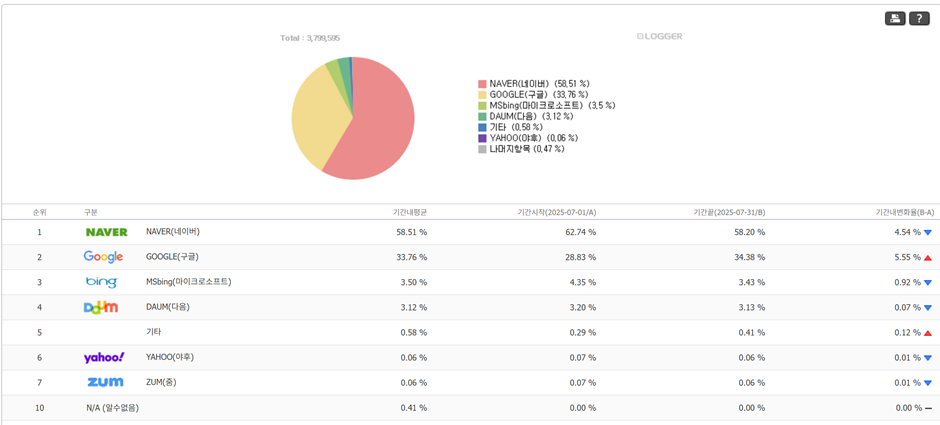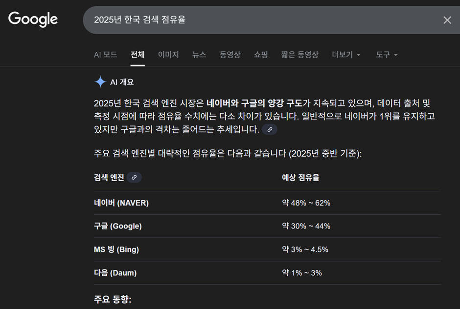 데이터는 명확한 균열을 보여준다. 불과 2년 전 70%에 육박하던 네이버의 독점적 검색 점유율은 2025년 말 기준 58% 선까지 하락했다. 반면, 같은 기간 구글의 점유율은 40%에 육박하고 있다.