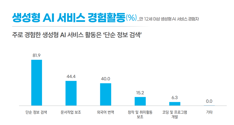 그리고 ‘검색 패러다임도 바뀌고 있다. 즉, ‘경쟁자’가 아닌 ‘게임의 룰’ 자체가 바뀌고 있다는 점이다. 우리는 어느 순간부터 생성형 AI를 검색 서비스로 활용하고 있다. 한국인터넷진흥원(KISA, 2024)에 따르면 생성형 AI 사용 목적의 80.2%가 ‘정보 검색’이며, 이미 국내 챗GPT(ChatGPT)의 월간 활성 사용자(MAU)는 2000만 명을 넘어섰다.