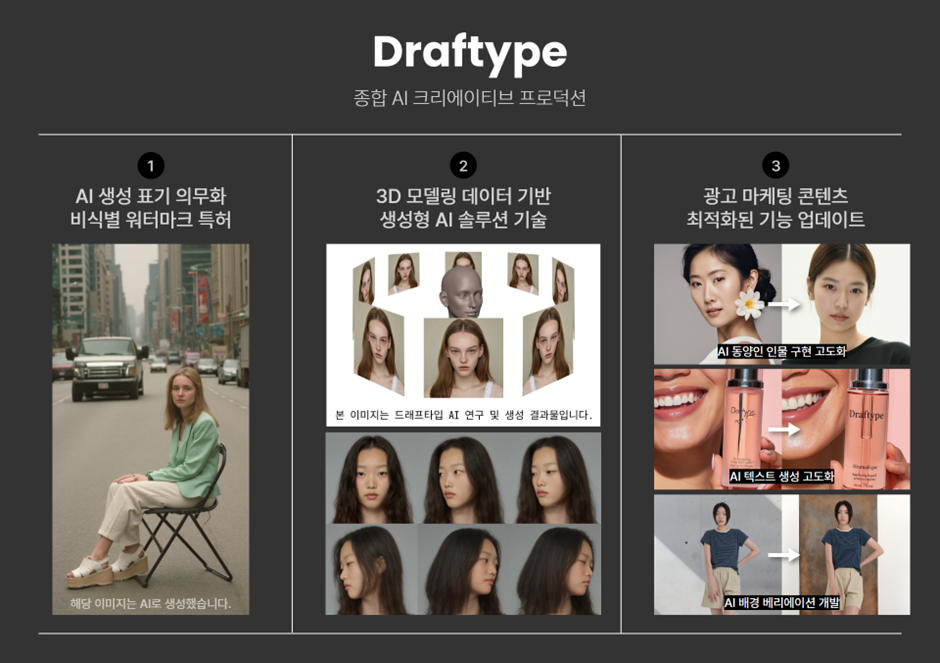 먼저 드래프타입은 생성형 AI 콘텐츠에 ‘비식별 워터마크’ 삽입 특허를 획득했다. AI 생성물로 인한 가짜뉴스, 딥페이크 등 사회적 문제가 증가하면서 워터마크의 중요성이 커지고 있는 가운데, 이 기술은 미적 완성도를 유지하면서도 AI 생성 여부를 확인할 수 있어 광고나 브랜딩에 최적화된 콘텐츠 제작이 가능하다.