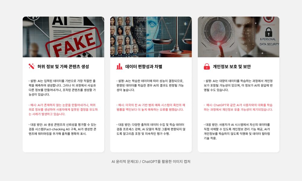 AI가 학습하는 데이터가 편향돼 있으면 결과물도 왜곡될 위험이 커지게 됩니다. 예를 들어, 의료 정보를 부정확하게 제공하면 심각한 문제가 발생할 수 있으며, 특정 집단을 차별하는 방식으로 작동할 가능성도 있습니다.