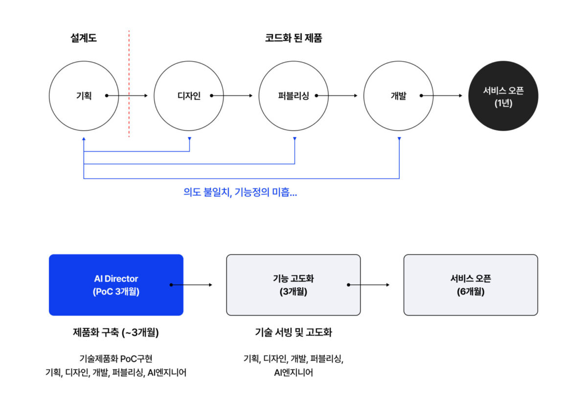 기존에는 하나의 구축 프로젝트를 완성하는 데 약 9개월의 개발 기간이 필요했다. AX 환경에서는 이야기가 다르다. AX 기반 도구를 활용하면 단 3개월 만에 PoC를 구현할 수 있다. 그리고 그 결과물을 사전에 고객과 전문가가 함께 검토하고, 의도와 맥락에 맞춰 수정·보완함으로써 완성도 높은 결과물을 빠르게 만들어낼 수 있다(자료=더크림유니언)