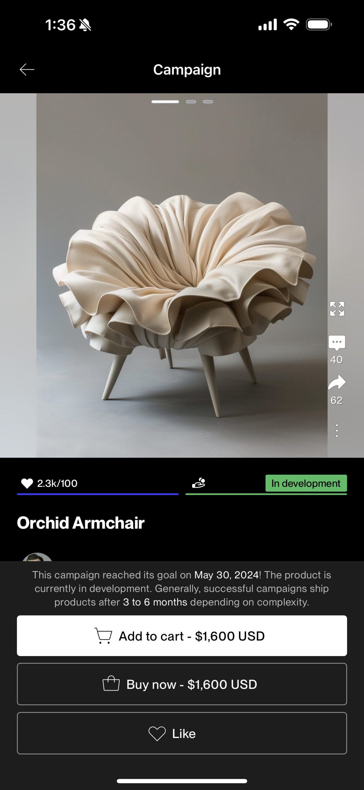 변화를 잘 보여주는 사례로 ‘Offscript’ 앱이 있다. 이 앱은 크리에이터가 생성형 AI를 사용해 만든 이미지를 업로드하면, 인기 있는 디자인(앱 내 ‘좋아요’ 기준)을 실제로 생산해준다. 의류뿐 아니라 의자와 같은 가구에 이르기까지 다양한 디자인이 이 과정을 통해 실제로 양산되어 판매되고 있다.
