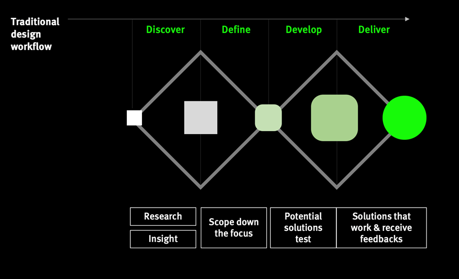 대표적인 디자인 프로세스로 꼽히는 더블 다이아몬드는 2005년 영국 디자인 위원회(British Design Council)가 제안한 방법론이다. 이 모델은 두 개의 다이아몬드 구조로 문제 해결 과정을 표현하며, 발견(Discover)-정의(Define)-발전(Develop)-전달(Deliver)의 단계를 통해 발산과 수렴을 두 번 반복한다.