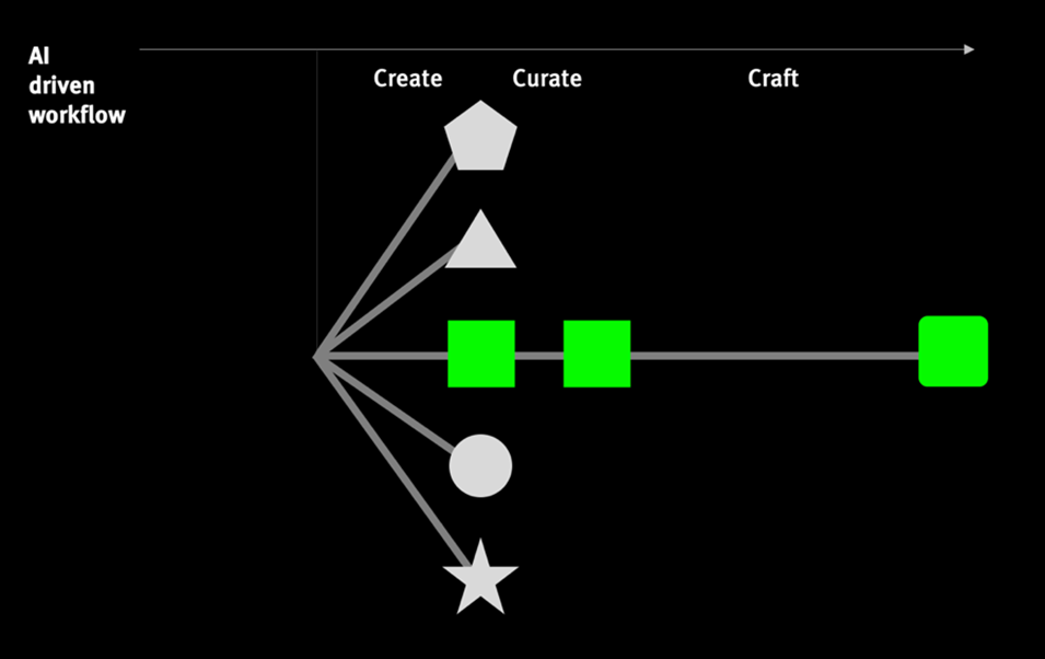 필자의 경험에 따르면, 최근의 AI 기반 디자인 프로세스는 위 다이어그램과 같이, 생성(Create), 큐레이션(Curate), 제작(Craft)이라는 세 가지 단계로 구성된다.