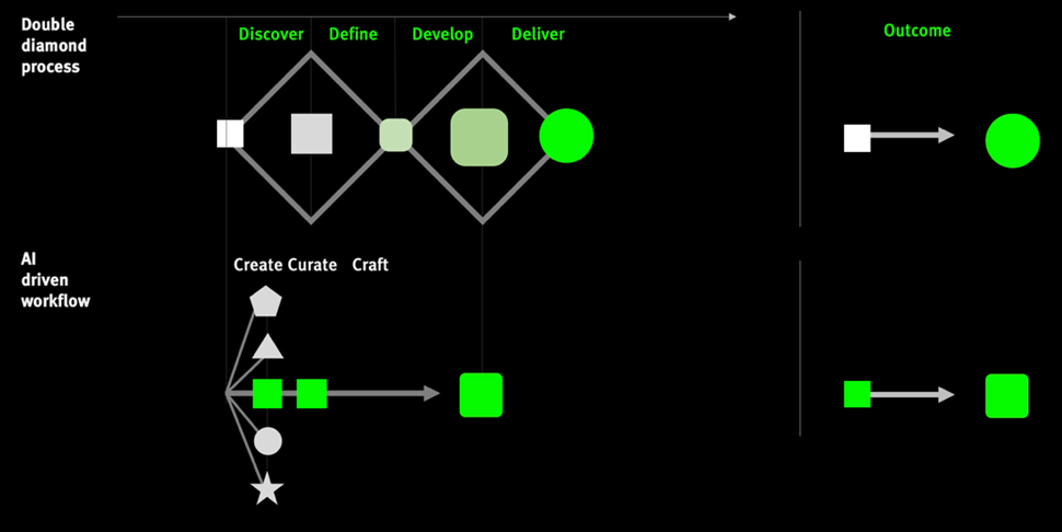 반면, AI 기반 디자인 프로세스는 앞 부분의 생성(Create)과 큐레이션(Curate) 단계가 최적화(Craft) 단계에 비해 상당히 빠르게 진행된다. 디자이너는 프롬프트 입력으로 짧은 시간 안에 수십, 수백 개의 디자인 안을 생성할 수 있으며, 그 중에서 적절한 안을 선택하는 과정도 빠르게 이루어진다. 이렇게 가속화된 프로세스는 전체 작업 시간을 대폭 단축시킨다.