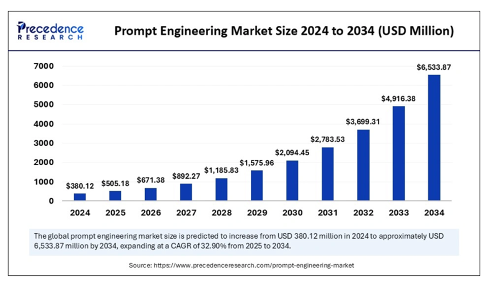 AI 활용이 사회 전 분야로 확대되면서 프롬프트 엔지니어에 대한 수요가 급증하고 있다. 디자인 분야에도 생성형 AI가 본격적으로 적용되면서, 디자이너의 역할이 프롬프트 엔지니어로 확장되고 있다. 프롬프트 엔지니어링 시장은 2024년 3801억2000만 달러였던 시장 규모가 2025년 5051억8000만 달러로 증가하고, 2034년까지 약 6조5338억7000만 달러에 이를 것으로 예측된다.