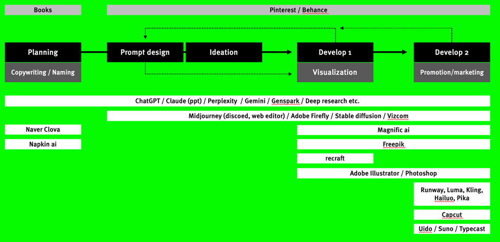 디자인 툴의 생태계는 AI 기술의 등장으로 그 어느 때보다 다양하고 복잡해졌다. 이제 디자이너는 어도비와 같은 전통적인 디자인 소프트웨어뿐 아니라, 다양한 AI 기반 도구(서비스)들을 자유롭게 넘나들며 사용할 수 있어야 한다. 이는 단순히 여러 소프트웨어를 다룰 수 있다는 의미를 넘어, 각 도구의 강점과 한계를 이해하고 이를 상황에 맞게 조합해 사용할 수 있는 능력을 뜻한다.
