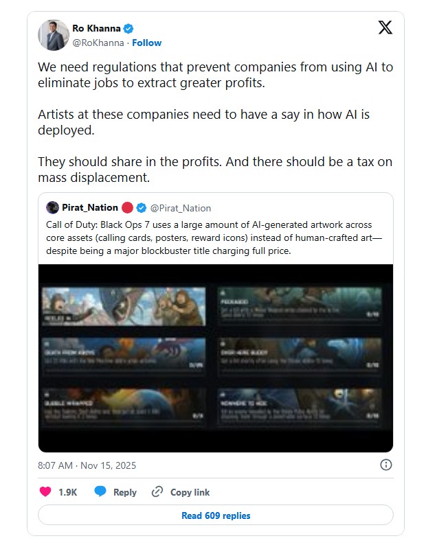 심지어 이런 반발은 정치권의 게임 업계 AI 규제 움직임까지 이어지고 있다. 실제 블랙옵스7 AI 논란 사태 이후, 로 카나(Ro Khanna) 미국의 연방 하의의원은 블랙옵스7 AI 논란 사태에 대한 게시글을 인용하며 “기업이 더 큰 이윤을 위해 일자리를 없애는 데에 AI를 사용하는 것을 막는 규제가 필요하다. 또한 아티스트들은 AI가 어떻게 배포되고 사용되는지에 대해 발언권을 가져야 한다” 라고 말하면서 무분별한 AI 사용 및 개발자 해고에 대한 규제 필요성을 촉구했다.