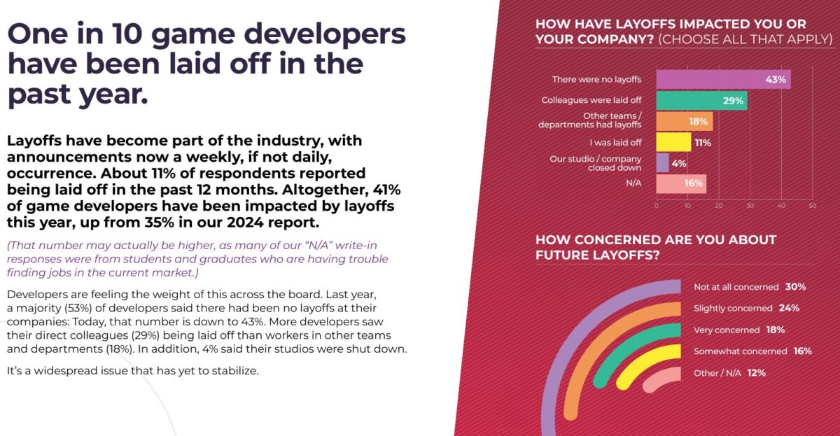 실제 지난 1월 세계게임개발자회의 GDC가 공개한 설문조사 결과 리포트에 따르면 설문 전체 응답자 중 41%가량이 해고에 영향을 받았으며, 개발자의 30%가 생성형 AI가 게임 산업에 부정적인 영향을 미칠 것이라고 답했다. 해고의 주된 이유로는 회사의 구조조정이 22%, 매출 감소가 18%, 시장의 변화가 15%로 꼽혔다.