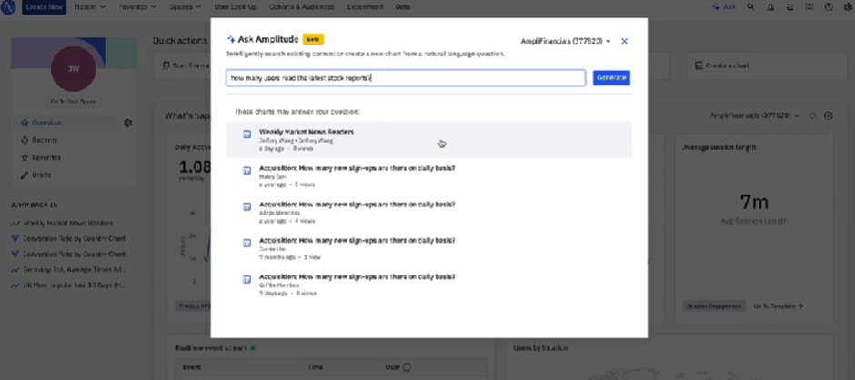 두 용어 사이에서 많은 혼동이 있다고 생각했기 때문이다. AI 에이전트의 핵심을 알기 위해서는 둘의 개념적 차이를 분명히 해야 한다. 생성형 AI의 핵심은 상호작용이다. 앰플리튜드를 예로 들어 설명해보겠다. 앰플리튜드에는 ‘애스크 앰플리튜드(Ask Amplitude)’라는 생성형 AI 기능이 있다. 애스크 앰플리튜드의 주요 기능은 데이터에 대한 사용자의 질의에 대한 적절한 답변을 제공하는 것이다.