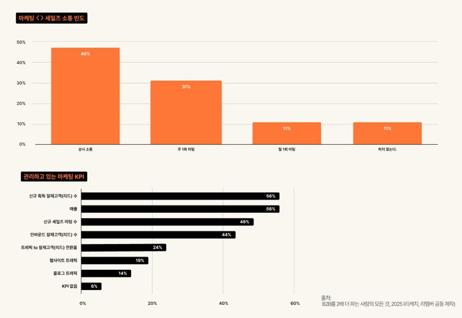 매출이 2배 이상 성장한 기업의 81%는 마케팅팀과 세일즈팀 간 최소 주 1회 이상 정기적으로 소통하며 협업하고 있었습니다. 정기적인 소통을 통해 양 팀은 리드 발굴에서 세일즈 미팅, 계약 체결까지의 전체 프로세스를 공동 관리합니다.