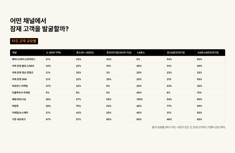 타깃 고객 규모별 잠재 고객 발굴 채널(자료=B2B를 2배 더 파는 사람의 모든 것)