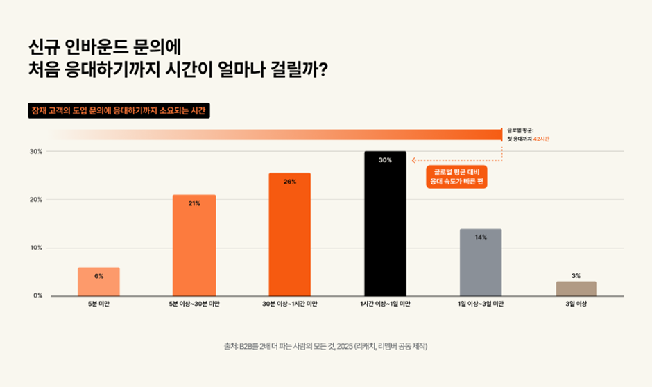 이번 조사에 따르면, B2B 세일즈 성공의 핵심 요소는 바로 ‘신속한 응대’였습니다. 응답 기업의 52%가 인바운드 문의를 받은 후 1시간 내 응답하고 있었으며, 특히 상위 기업들은 5분 이내에 응답하는 경우도 있었습니다. 글로벌 평균 응답 시간인 42시간과 비교하면 매우 빠른 속도죠.