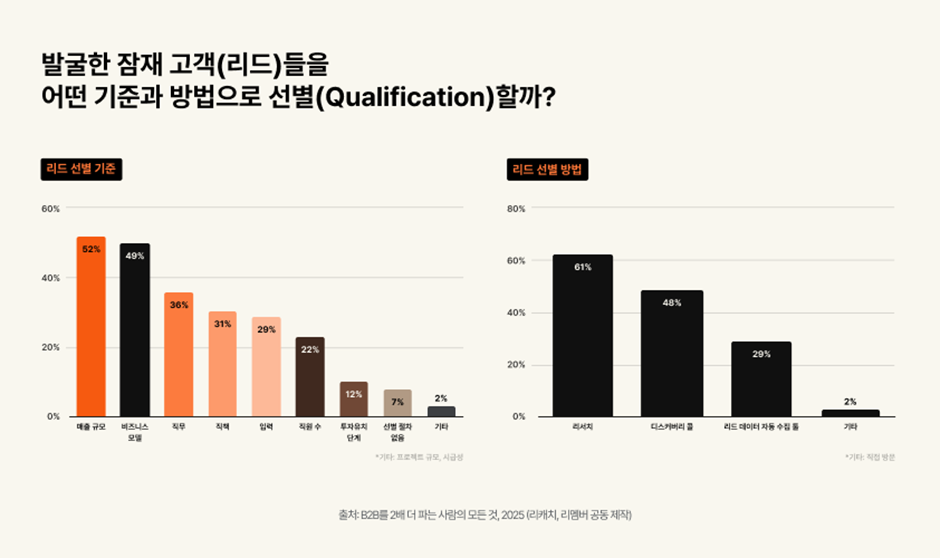 리드를 단순히 많이 확보하는 것만으로는 부족합니다. 매출이 높은 기업들은 잠재 고객의 적합성을 평가하는 ‘선별(Qualification)’ 단계에서 철저한 프로세스를 가지고 있습니다. 조사에 따르면, 매출 2배 이상 성장 기업 중 93%는 명확한 리드 선별 프로세스를 운영하고 있었으며, 특히 매출 규모와 비즈니스 모델, 직무와 직책을 기준으로 잠재 고객의 적합성을 평가했습니다.