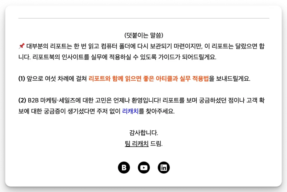 정기적으로 발송되는 뉴스레터는 리드가 우리를 잊지 않고 연결고리를 유지할 수 있도록 합니다. 이메일 시퀀스와 마찬가지로 리드가 매력적이라고 느낄 법한 내용을 담아 꾸준히 발송한다면, 우리에 대한 신뢰를 갖고 메일을 오픈하게 되겠죠. 신뢰가 쌓인다는 건, 그들이 원하는 정보만이 아닌 우리가 전하고 싶은 메시지를 전달했을 때 기꺼이 시간을 할애해 읽을 확률이 높아진다는 뜻입니다. 리소스가 부족하다면 비정기적으로 발송하는 것도 괜찮습니다. 중요한 건 리드가 첫 컨택 이후, 우리의 존재를 잊지 않고 관심을 갖도록 만드는 거예요. 리캐치 뉴스레터 예시 바로가기