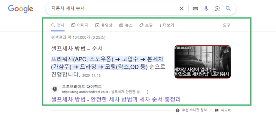 검색결과 페이지의 가장 최상단에 박스 표시와 함께 노출되는 스니펫을 피처드 스니펫이라고 합니다. 추천 스니펫이라고도 불러요. 구글 시스템에서 사용자에게 이 형식이 도움이 된다고 판단되면 추천 스니펫을 표시합니다. 추천 스니펫은 전체 검색 결과나 관련 질문(People Also Ask)에서 표시되거나, 지식 그래프에 포함된 내용과 함께 나타날 수 있어요.