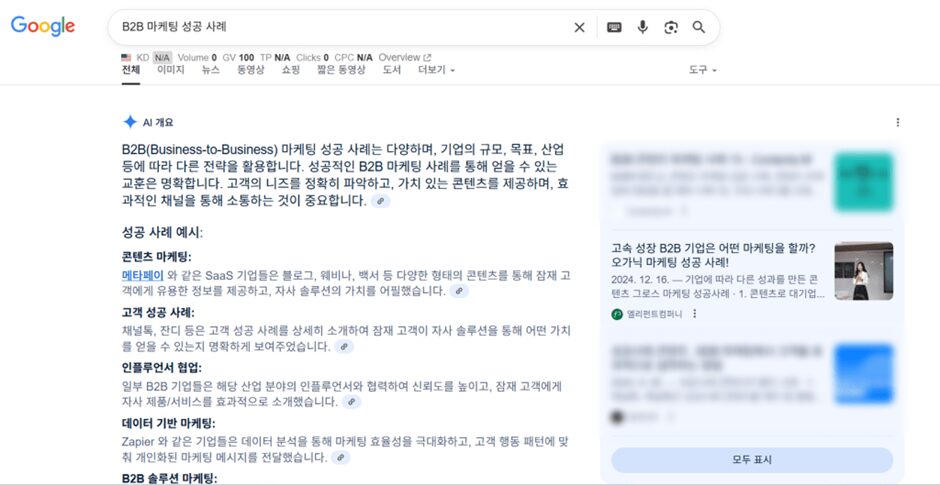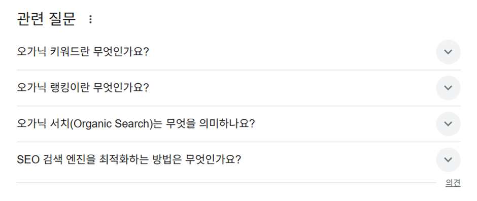관련 질문(People Also Ask)은 구글 검색 결과에서 사용자가 검색한 질문과 관련된 추가 질문을 보여주는 영역입니다. B2B 마케팅을 위해 콘텐츠를 제작할 때, 관련 질문을 참고해서 검색 사용자의 질문에 대한 답변을 제공하는 콘텐츠를 제공한다면 검색 결과 상위에 노출될 가능성이 높아집니다.