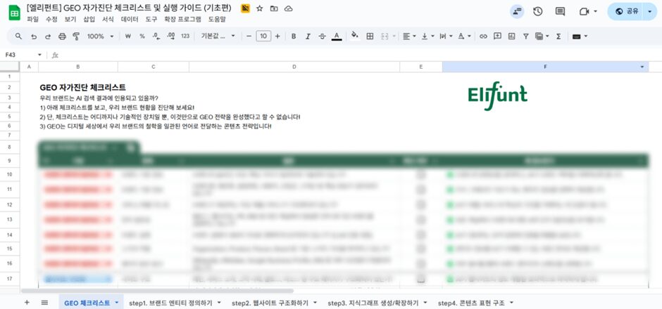 엘리펀트컴퍼니가 2025년 상반기까지의 최신 정보를 취합하고 정리해 GEO 자가진단 체크리스트를 제작했습니다. 아래 체크리스트를 통해, 디지털 세상에서 우리 브랜드의 철학을 일관되고 정제된 언어로 전달할 수 있도록 GEO 최적화 전략을 지금 바로 실행해 보세요.