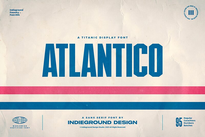 Atlantico는 Femme(둥근 각), Homme(직각)의 두 버전으로 구성된 산세리프 서체입니다. 이름처럼 바다와 화학의 대비에서 영감을 얻었으며, 일렉트로닉 음악이나 미래지향적 디자인 프로젝트에 활용하면 효과적입니다. 단, 개인용 무료 사용만 허용됩니다.