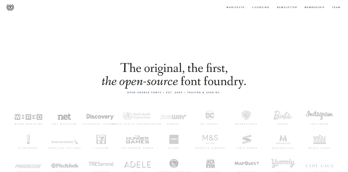 디자이너 커뮤니티 기반으로 성장한 오픈소스 영문 폰트 플랫폼입니다. 타이포그래피 교육, 개발자 UI 등에서 자주 활용됩니다.